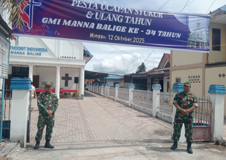 Benhillpos.com | BALIGE – Dalam rangka mendukung terciptanya situasi yang aman dan kondusif di wilayah binaan, Babinsa Koramil 17/Balige Kodim 0210/TU, Serka A.R Situmorang dan Serda B Silaban, melaksanakan kegiatan pengamanan ibadah mingguan di Gereja Methodist Indonesia Desa Hinalang Kecamatan Balige Kabupaten Toba Provinsi Sumatera Utara, Minggu (12/10/2025)