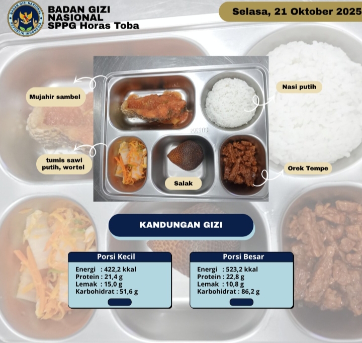 Sedangkan Menu yang disuguhkan oleh Dapur Horas Toba Yayasan Bisukma Bangun Bangsa di 8 sekolah di Kecamatan Balige yaitu Nasi putih, Mujahir Sambel, Orek Tempe, Tumis sawi putih wortel dan Salak