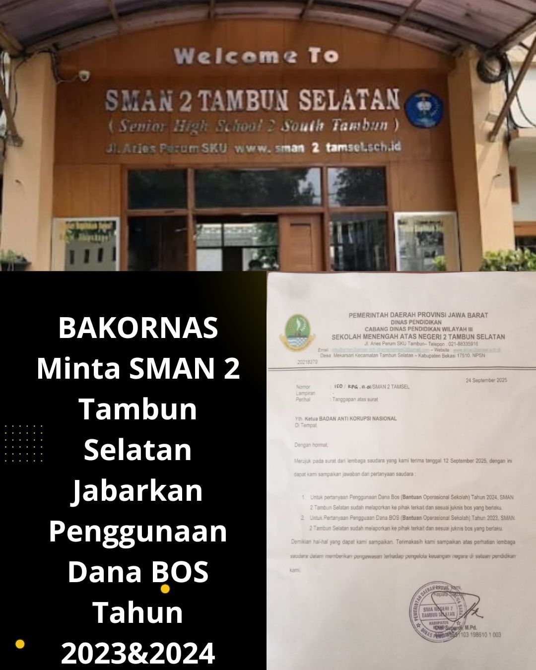 Saut juga menyampaikan kepada awak media, setelah BAKORNAS mengirimkan surat kedua, pihak SMAN 2 TAMBUN SELATAN langsung membalas pada tanggal 24/09/2025. Namun pihak SMAN 2 Tambun Selatan menjawab tidak sesuai apa yang dipertanyakan oleh BAKORANAS dengan isi surat jawabannya “ Untuk Pertanyaan Penggunaan Dana BOS ( Bantuan Operasional Sekolah ) Tahun 2023 dan 2024 SMAN 2 Tambun Selatan sudah melaporkan ke pihak terkait dan sesuai juknis bos yang berlaku ”
