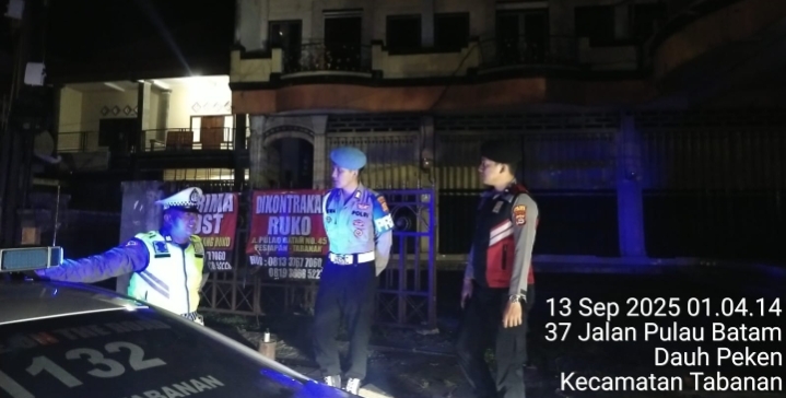Benhillpos.com | Tabanan – Polres Tabanan kembali melaksanakan Blue Light Patrol dalam rangka mengantisipasi tindak kejahatan 3C (Curat, Curas, Curanmor). Kegiatan berlangsung pada Sabtu (13/9/2025) dini hari pukul 00.30 s/d 02.00 WITA dengan melibatkan 18 personel gabungan piket fungsi Polres Tabanan yang dipimpin oleh Pawas Polres Tabanan, Iptu I Ketut Padnya.