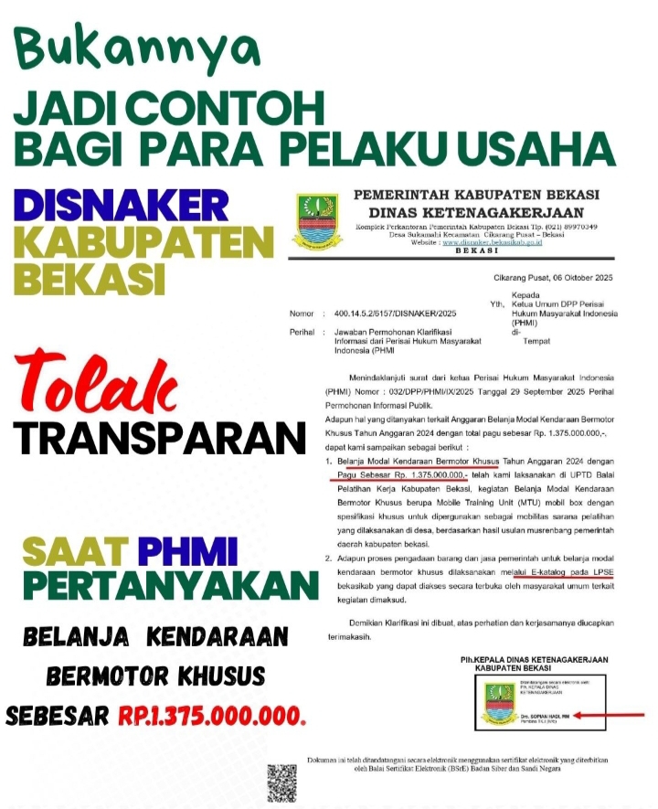 Bukannya Jadi Teladan, Disnaker Kabupaten Bekasi Tolak Untuk Transparan saat PHMI Soroti Belanja Kendaraan Bermotor Khusus Tahun 2024 sebesar 1,3 Miliar