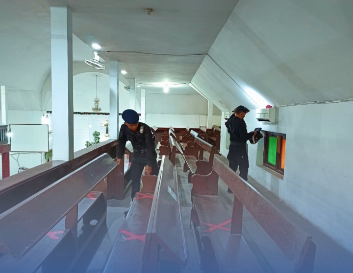 Setibanya di lokasi, personel terlebih dahulu berkoordinasi dengan pihak pengamanan wilayah sebelum melaksanakan sterilisasi secara menyeluruh. Pemeriksaan dilakukan pada berbagai area, mulai dari mimbar, ruang ibadah, kursi, sound system, hingga fasilitas pendukung seperti toilet, pot bunga, tempat sampah, serta area sekitar gereja.