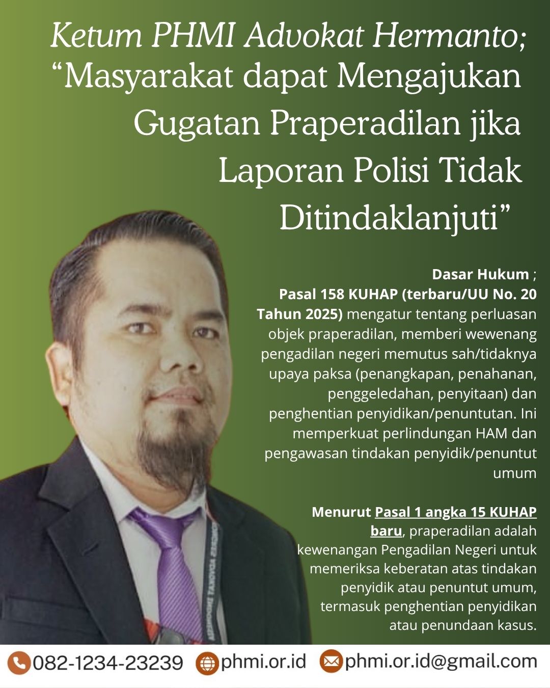 Sebagaimana ditegaskan dalam Pasal 158 KUHAP (terbaru/UU No. 20 Tahun 2025) mengatur tentang perluasan objek praperadilan, memberi wewenang pengadilan negeri memutus sah/tidaknya upaya paksa (penangkapan, penahanan, penggeledahan, penyitaan) dan penghentian penyidikan atau penuntutan. Ini memperkuat perlindungan HAM dan pengawasan tindakan penyidik/penuntut umum, ujar Hermanto.