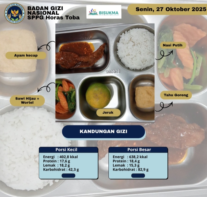 Sedangkan Menu yang disuguhkan oleh Dapur Horas Toba Yayasan Bisukma Bangun Bangsa di 8 sekolah di Kecamatan Balige yaitu Nasi putih, Ayam Kecap, Tahu Goreng, Sawi Hijau+Wortel dan Jeruk