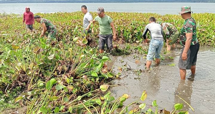 Pembersihan eceng gondok melibatkan seluruh anggota Kodim 0210/TU beserta masyarakat