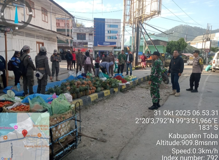 Benhillpos.com | BALIGE – Personel Koramil 17/Balige Kodim 0210/TU melaksanakan Pendampingan Dinas Koperindag Toba bersama Polsek Balige, Satpol PP Toba, Dinas Pasar dan Dishub dalam rangka penertiban pedagang kaki lima yang berjualan yang akan menyebabkan kemacetan di sekitar Pasar Balige, pada Jumat (31/10/2025)