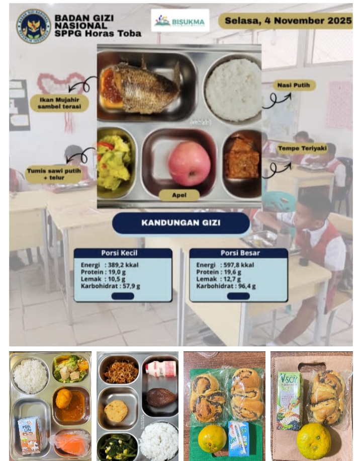 Sedangkan Menu yang disuguhkan oleh Dapur Horas Toba Yayasan Bisukma Bangun Bangsa di 8 sekolah di Kecamatan Balige yaitu Nasi putih, Mujahir sambel terasi, Tempe teriyaki, Tumis sawi putih + telor dan Apel