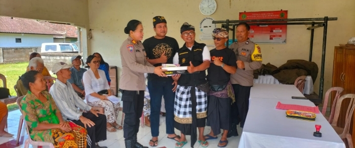 Benhillpos.com | TABANAN – Kanit Bimas Polsek Tabanan AKP Ni Ketut Merta didampingi oleh Bhabinkamtibmas Desa Wanasari Aiptu I Made Mertajaya bersama Panit 1 Bimas Polsek Tabanan menyerahkan sarana kontak kepada masyarakat di Bale Banjar Priyukti, Desa Wanasari. Sabtu 13 September 2025 pukul 09.00 WITA.