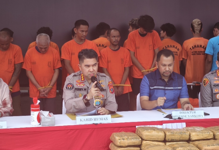 Kombes Pol Ferry menguraikan barang bukti hasil pengungkapan, antara lain 145 kg sabu, 76 kg ganja, 76.712 butir ekstasi, serta 15.166 butir Happy Five.