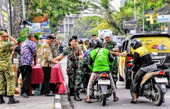 Pembagian takjil dilakukan oleh jajaran prajurit Korem 031/WB kepada pengendara roda dua, roda empat, serta warga yang melintas di kawasan Makorem menjelang waktu berbuka puasa.